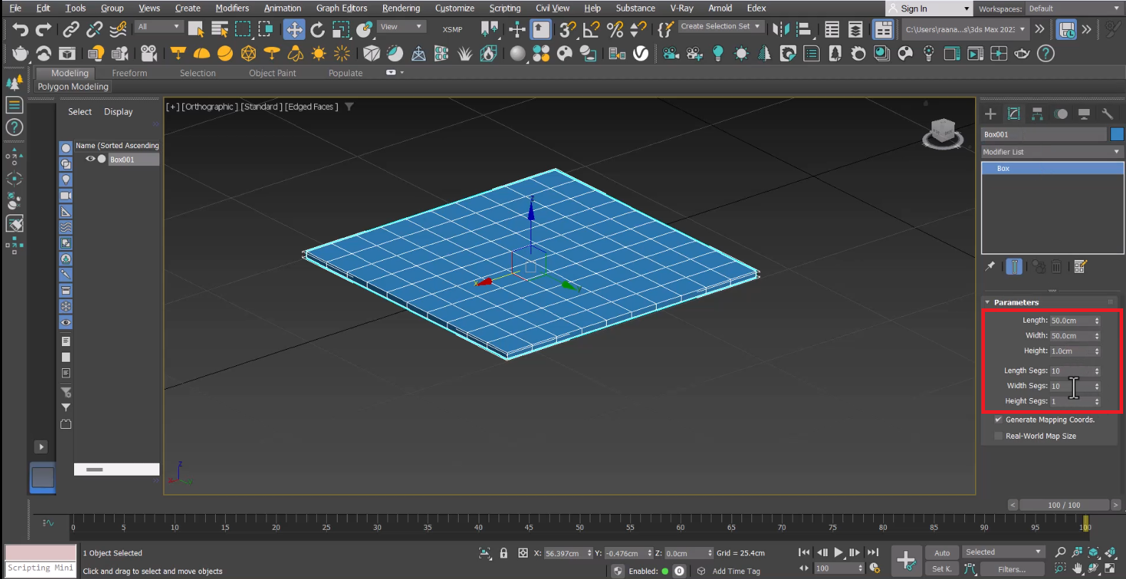 چون قرار است از Modifier Cloth استفاده کنیم، تعداد سگمنتهای باکس باید بالا باشد تا تغییر شکل نرم و طبیعی ایجاد شود.