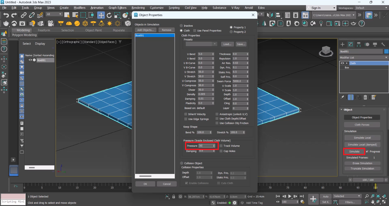 سپس از بخش Object Properties باکس خود را انتخاب کرده و حالت آن را روی Cloth میگذاریم.
