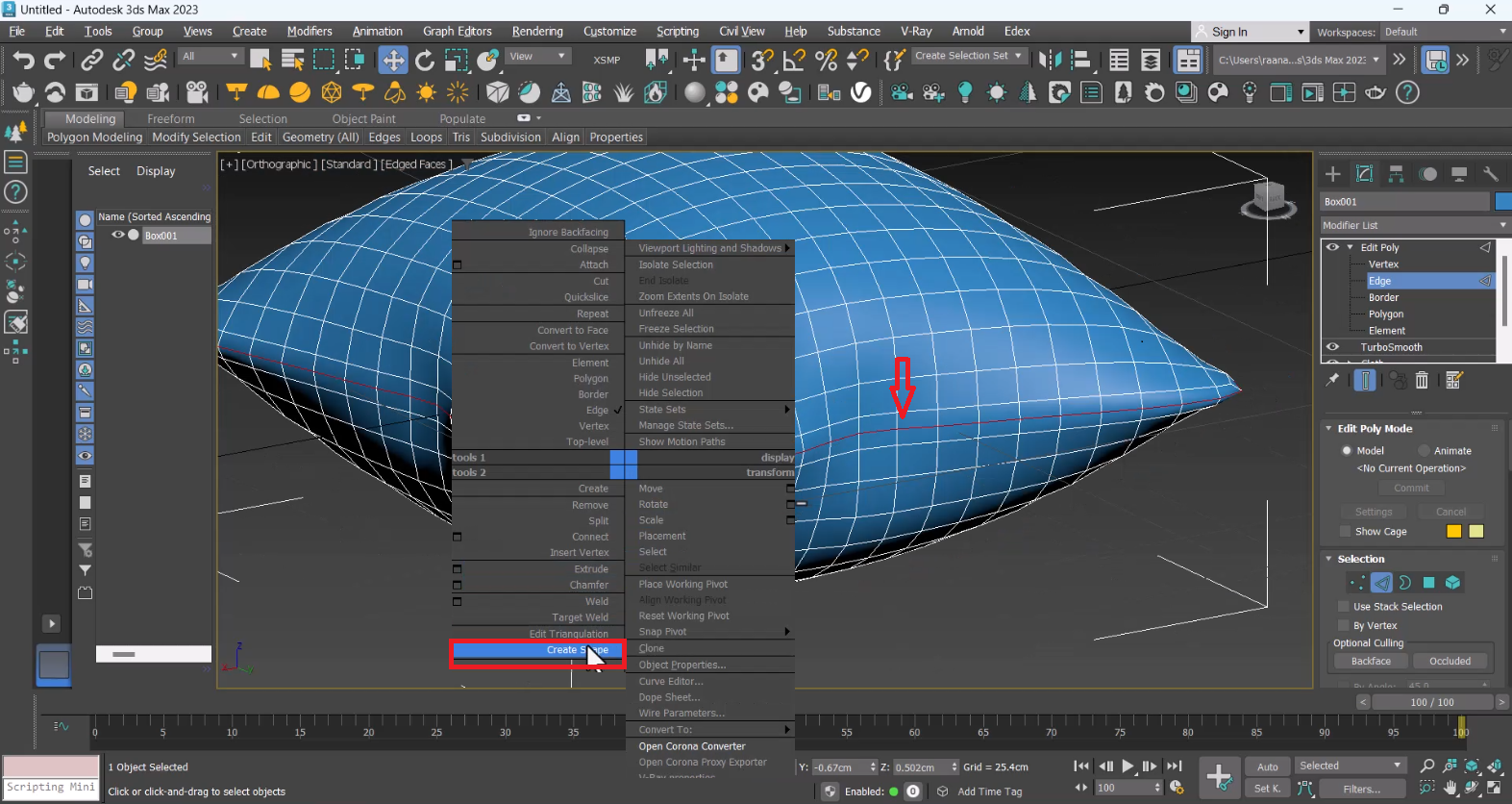 برای اینکه لبههای کوسن واقعیتر دیده شود، یک Modifier Edit Poly اضافه میکنیم.