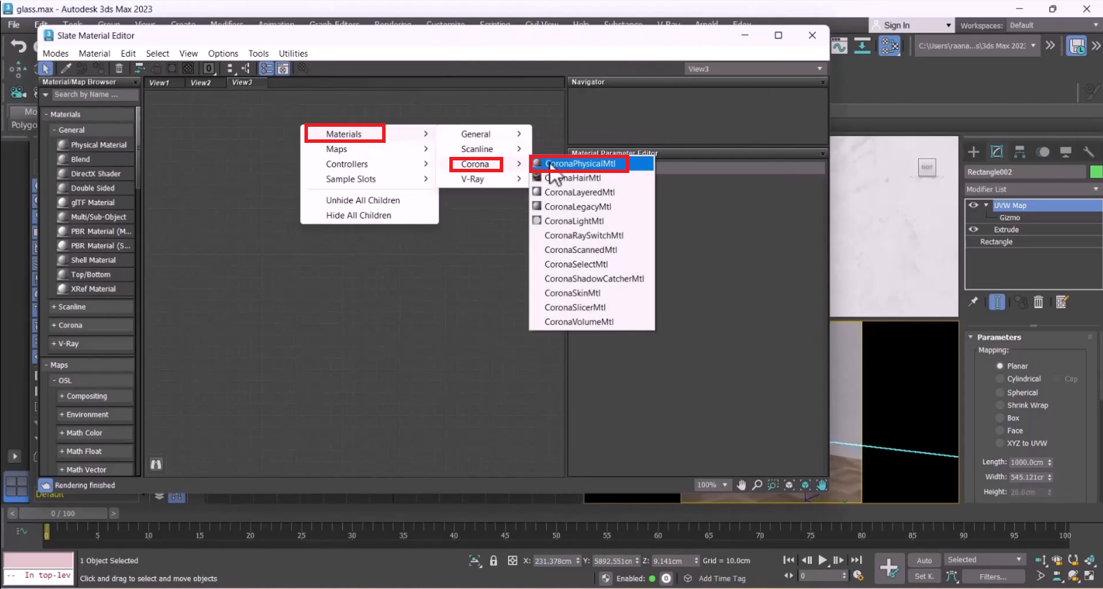 سپس با کلیک راست روی صفحه متریال و انتخاب Corona Physical Material، یک متریال شیشه آماده به صفحه اضافه میکنیم.