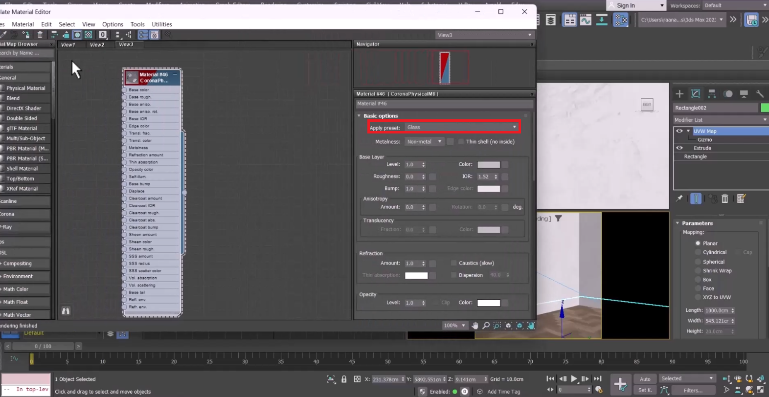 برای این کار یک متریال ساده کرونا را انتخاب کرده و روی آبجکت (مثلاً پنجره) اعمال میکنیم.