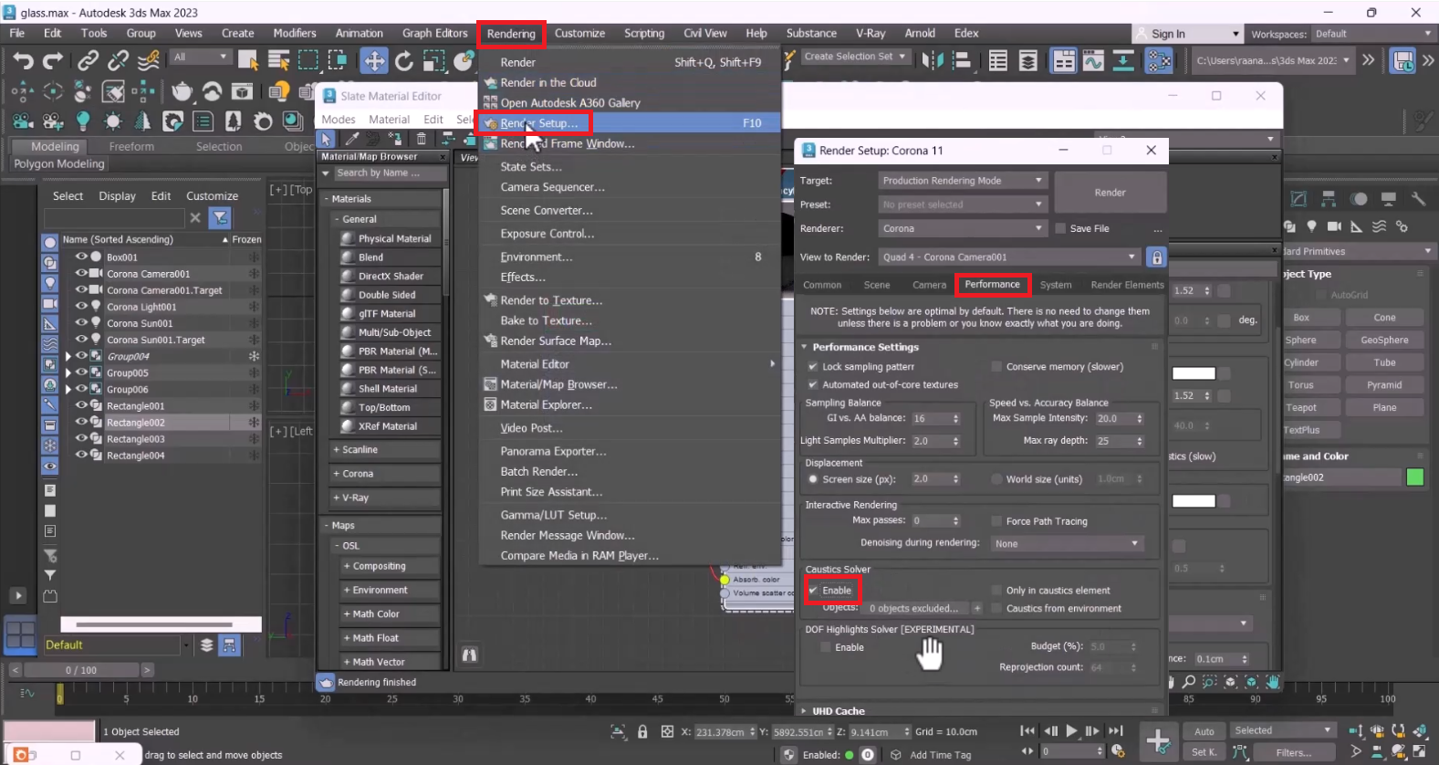 برای واقعیتر شدن بازتاب نورها روی سطح، میتوانیم گزینه Caustics را فعال کنیم. این قابلیت باعث میشود شکست و انعکاس نور روی سطوح مختلف طبیعیتر شبیهسازی شود. البته باید توجه کنید که فعالسازی Caustics ممکن است زمان رندر را کمی افزایش دهد.