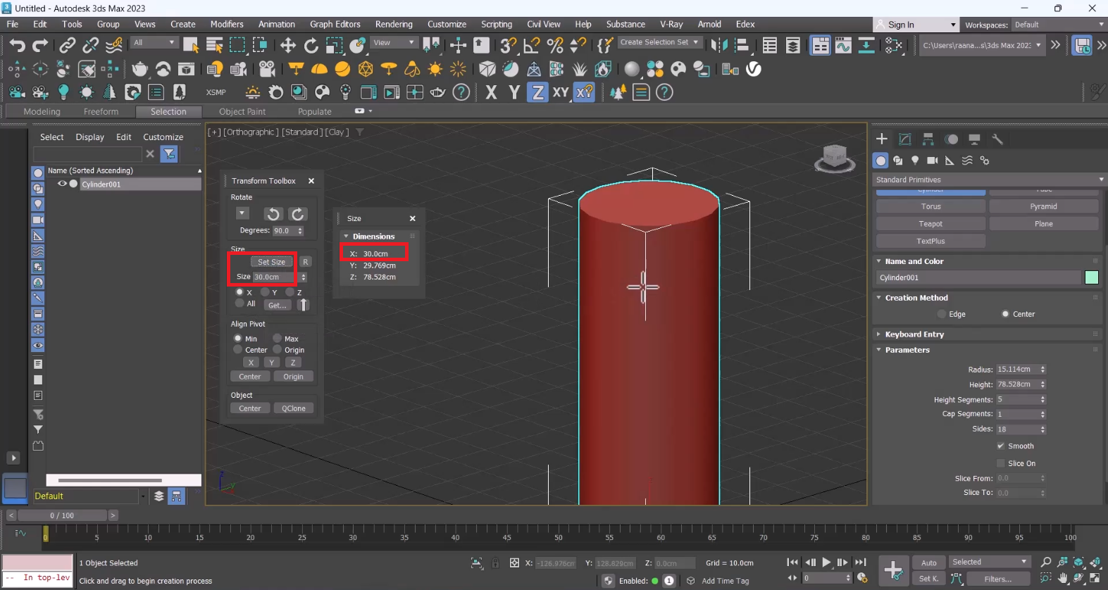میخوام طول آبجکت در راستای محور X دقیقاً ۳۰ سانتیمتر باشه. پس عدد ۳۰ رو وارد میکنم، محور X رو انتخاب میکنم و روی Set Size میزنم.